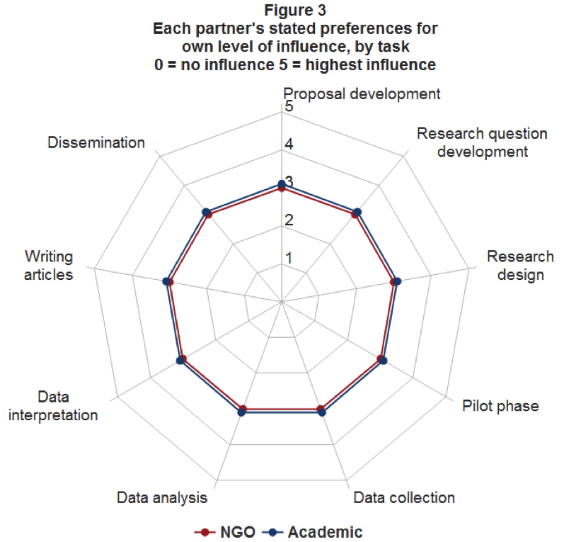 One extreme is the complete independence of the partners; that is, complete division of both labor and influence. This might consist of the NGO focusing exclusively on program delivery and the academic institution only on research, with no collaboration on any of the activities (though the project as a whole would be a collaboration, with each partner in charge of certain parts). The other end of the spectrum is the complete ‘co-production’ of research, where the partners have equal status and influence within the collaboration, and both have a voice throughout the research process. It may be that neither of these extremes ever occurs in practice, but there seems to be a gradual shift in the field of international development from the pole of independence towards that of closer collaboration throughout the research process, with an eye towards facilitating research to practice.